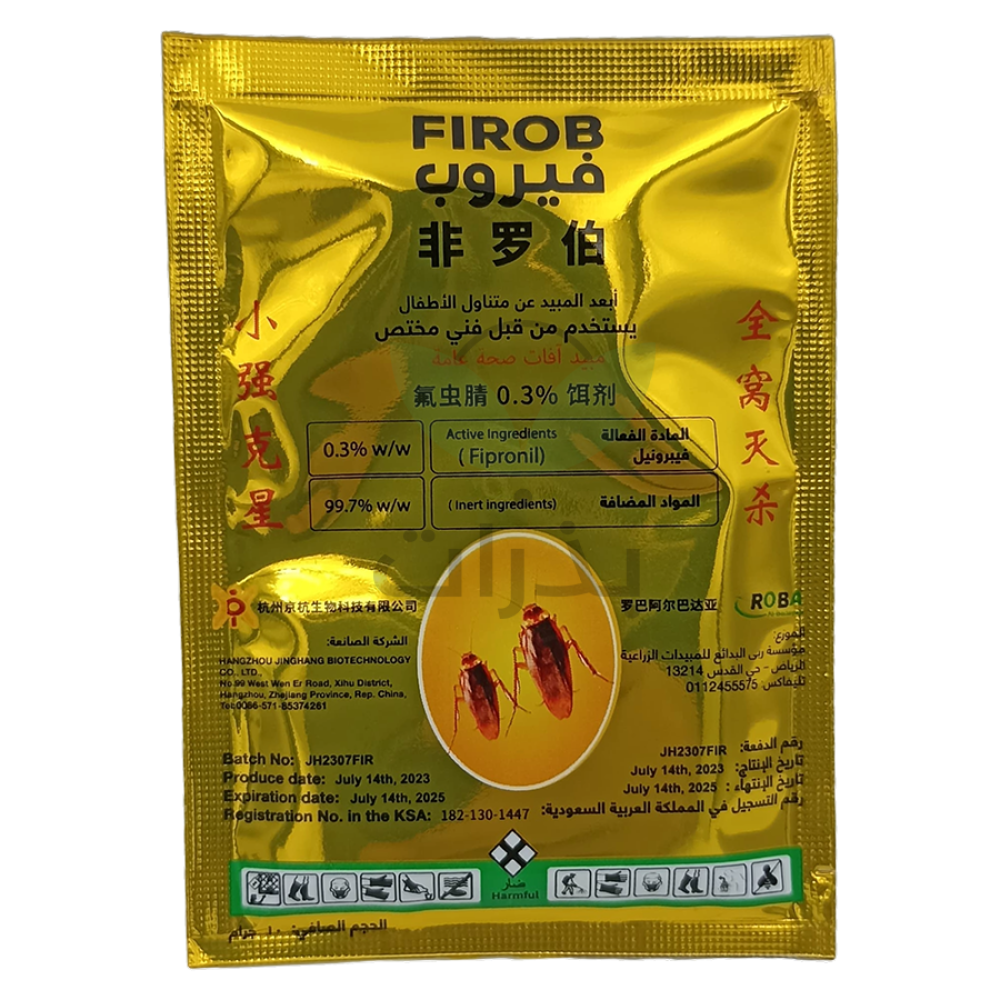 - فيروب مبيد حشري على هيئة حبيبات يحتوي على المادة الفعالة فيبرونيل وتنتمي إلى مجموعة فينيل بيرازول و يؤثر على النمل والصراصير عن طريق المعدة